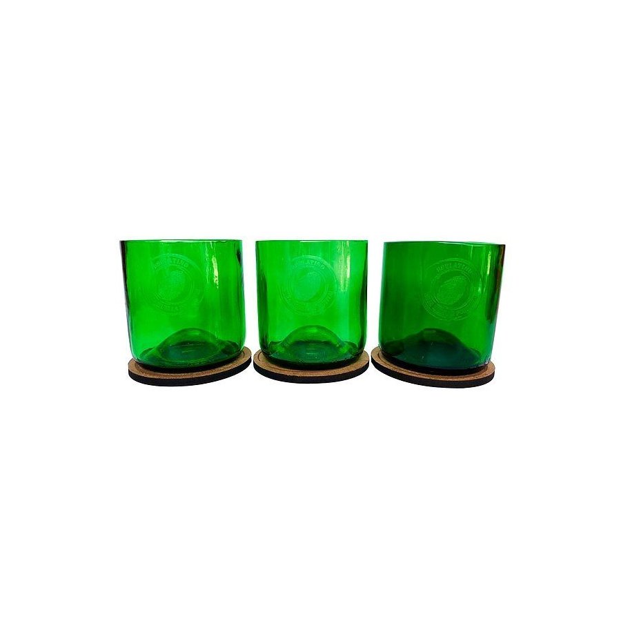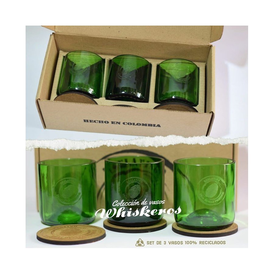 - Tres hermosos vasos de vidrio reciclado, de excepcionales detalles y magistral factura; en un deslumbrante estuche de madera, también reciclada.