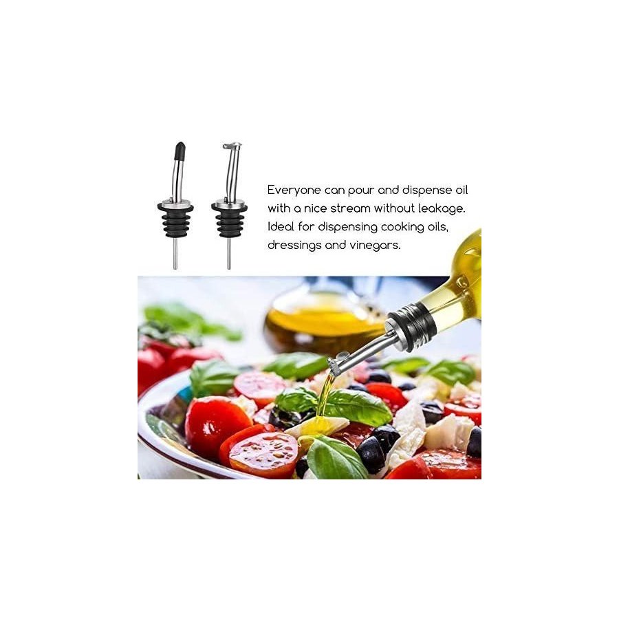 - DISEÑO SIN GOTEO: los picos de vertido de acero inoxidable 18/8 con tapa sellada y tapa con solapa se ajustan bien a la botella y evitan perfectamente la entrada de polvo. Todos pueden verter y dispensar aceite con un buen chorro sin fugas. Ideal para dispensar aceites de cocina, aderezos y vinagre.