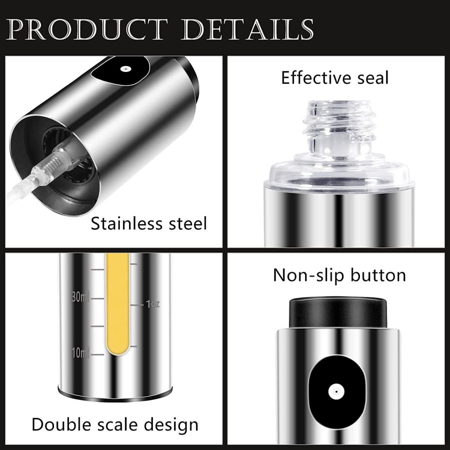 - Caja de acero inoxidable: El rociador envuelto en acero inoxidable, no es fácil de romper y no muestra huellas dactilares, es resistente y se atornilla firmemente. El interior de PP plástico reduce el peso del rociador de aceite y no consume fuerza en la mano.