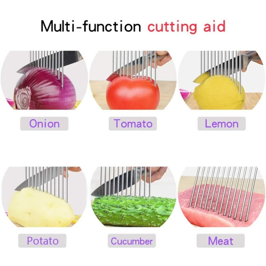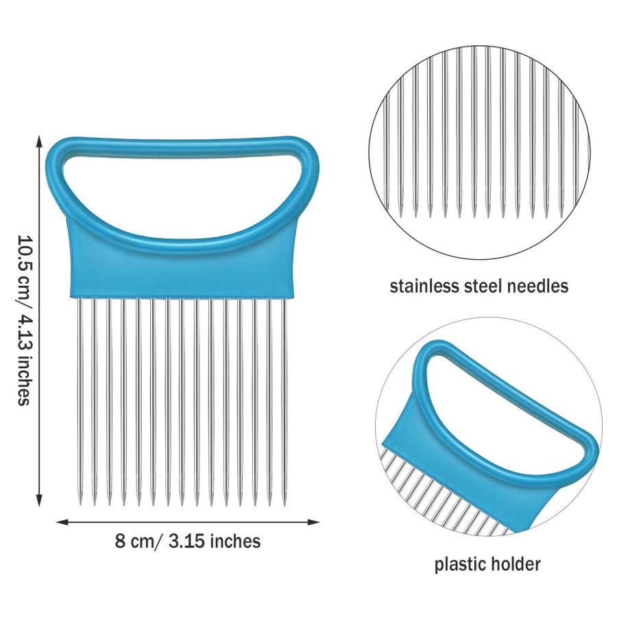 • MULTIFACÉTICO: No solo diseñado para cebollas. También se puede utilizar para otros ingredientes duros como frutas, patatas, zanahorias, limones e incluso ajo. El soporte para verduras también se puede utilizar como ablandador de carne. La aguja larga de acero penetra profundamente en la carne para mejorar su sabor. También es fácil de limpiar después de su uso. de peso ligero, todos pueden usarlo para cocinar