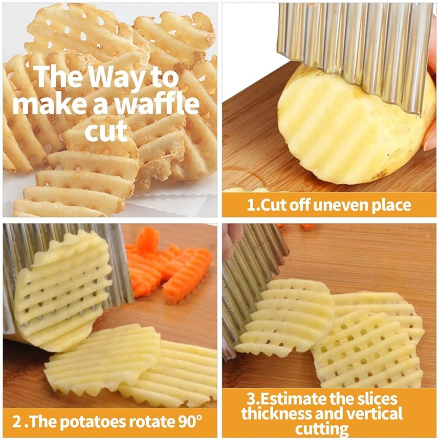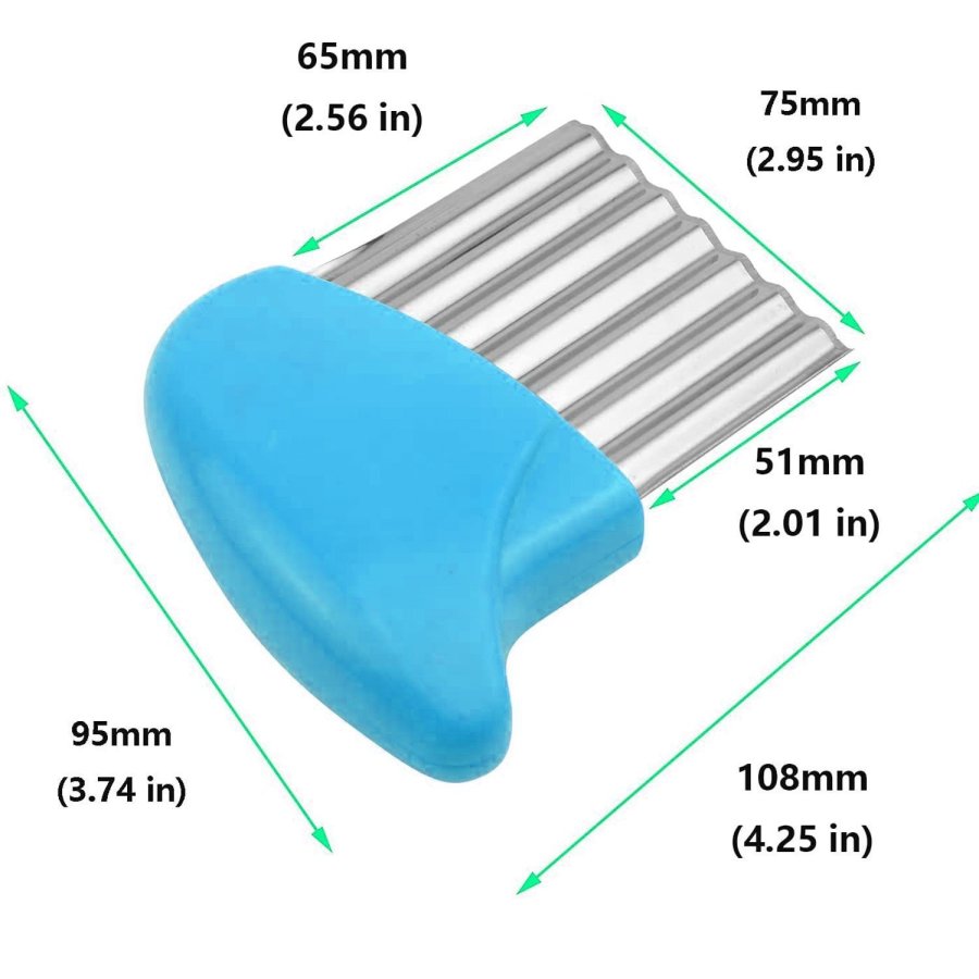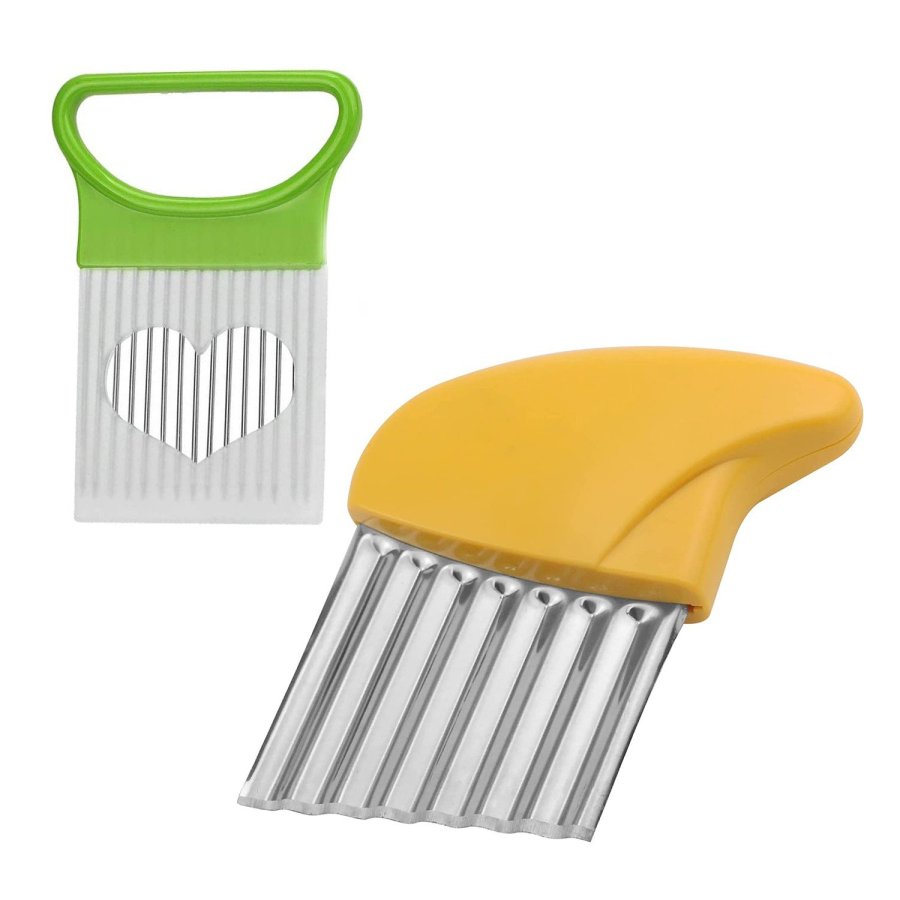 • Cortadores de arrugas, rebanador ondulado para picar verduras, frutas, papas, gofres fritos, chips de pepinillos para hacer ensaladas y guarniciones elegantes para una bonita decoración de alimentos. El cortador de frituras arrugadas es fácil de cortar papas, cebollas, tomates, limones, etc. tenga una cena familiar divertida o una barbacoa con sus hijos usando nuestro cuchillo seguro para frutas / verduras. El diseño competitivo y sin espacios, fácil de limpiar, sería un dispositivo de corte de cocina único en su hogar.