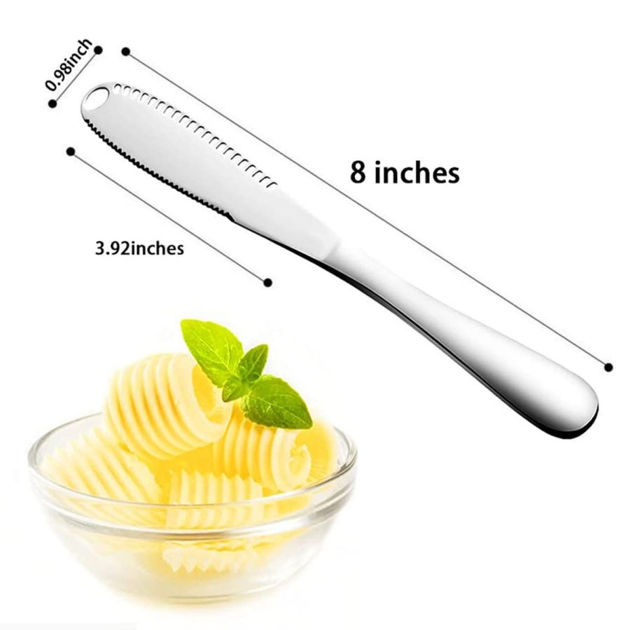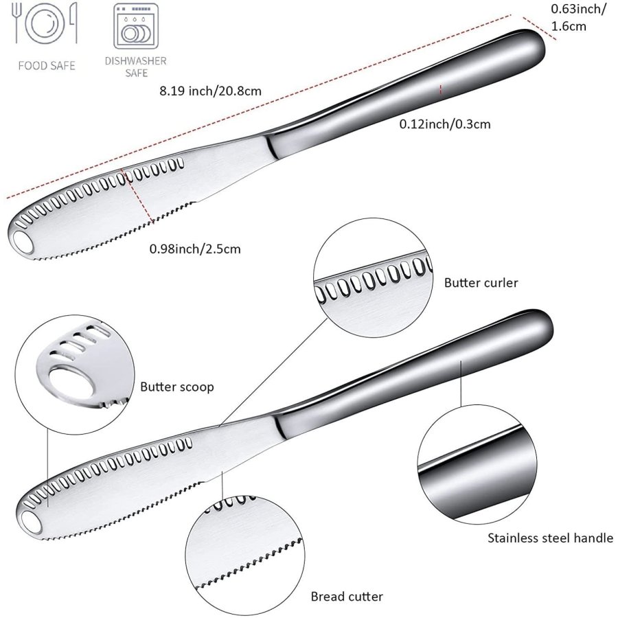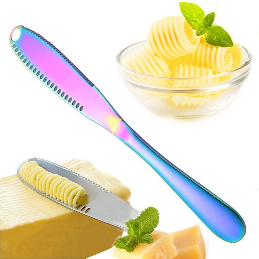 • RENDIMIENTO: su pan ya no se romperá en pedazos, los pequeños orificios ranurados que recorren el borde de la cuchilla están diseñados para rizar la mantequilla dura en su pan. Un agujero más grande diseñado para rizar grandes cantidades de mantequilla en una rica fuente de energía en tu tostada. ¡Con el cortador de queso adicional para esos días de queso lluvioso en tostadas!
