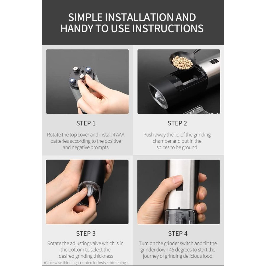 - Operación automática: nuestro molinillo de pimienta eléctrico con sensor de gravedad, simplemente encienda el molinillo y tendrá especias frescas molidas, conveniente y divertido. Funciona con pilas, cada molinillo requiere 4 pilas AAA (pilas no incluidas).
