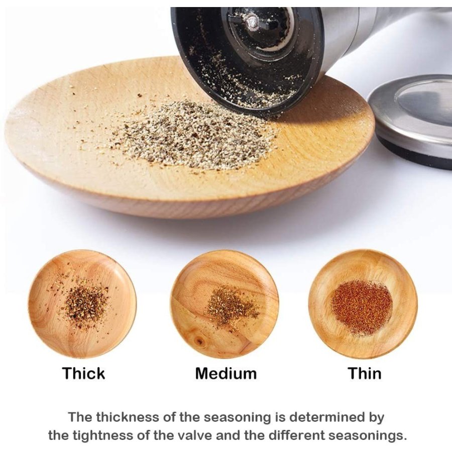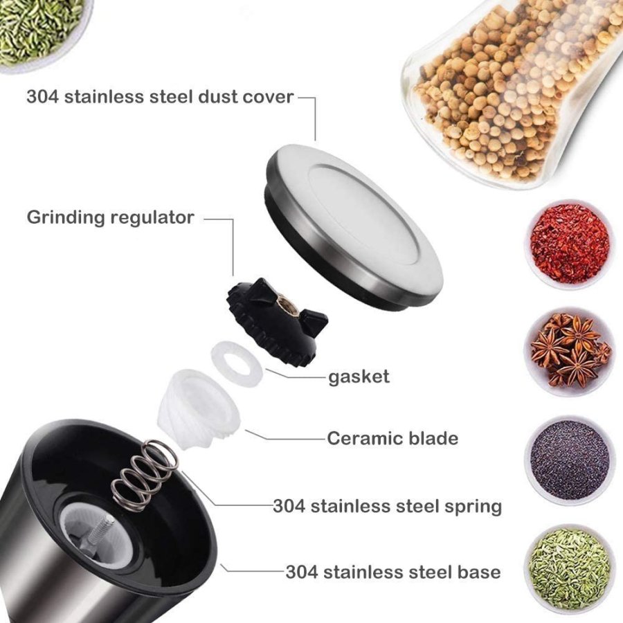 - CONSTRUIDO PARA LA COMODIDAD Y FUNCIÓN A diferencia de otros juegos de molinillos de especias, este par de molinillos de sal y pimienta tienen su mecanismo de molienda en la parte superior del molinillo, lo que garantiza que la sal y la pimienta terminen solo en su comida, no en toda su mesa. El molinillo de cerámica no es corrosivo y no absorbe los sabores, mientras que una perilla de plástico en la parte superior de cada molinillo de sal y pimienta le permite ajustar fácilmente de un molido fino a grueso.