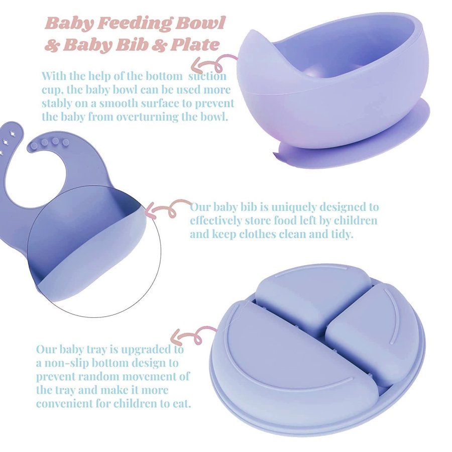 • Survive the "chuck-it-on-the-floor" stage with our silicone feeding sets. Each set includes an adjustable, easy-clean bib with pocket, an unbreakable, suction bowl and plate and child-friendly, easy grip spoon. All items are made from food-safe, high-grade silicone that can go in the dishwasher and microwave.