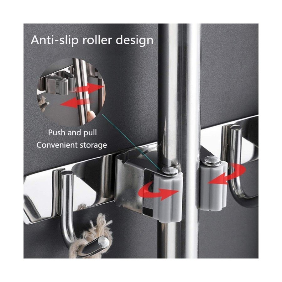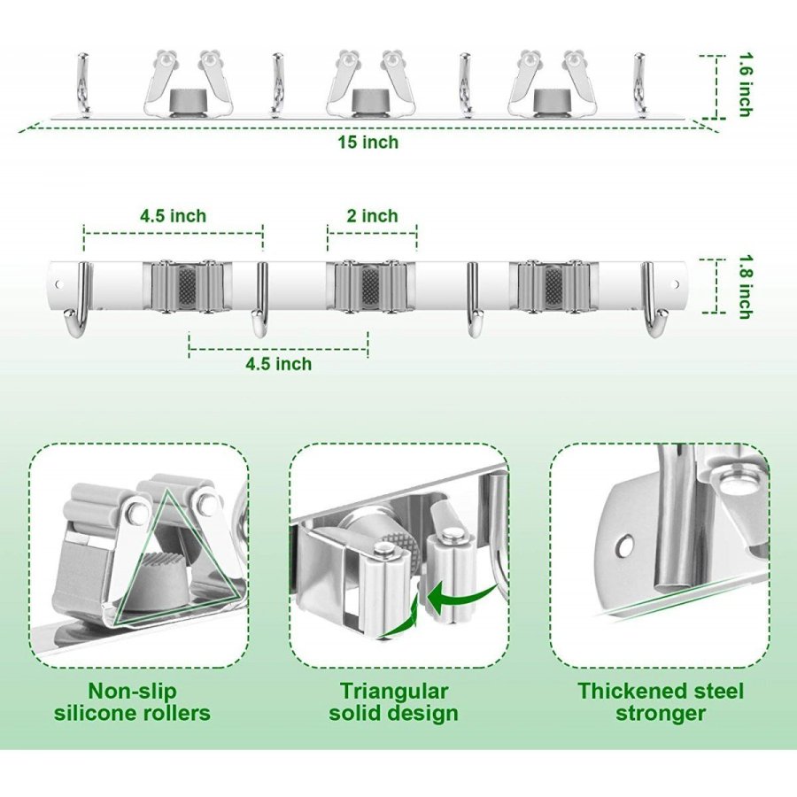 • Material de alta calidad: Diseño de 3 estantes y 4 ganchos, organice sus molestas herramientas de limpieza en un espacio pequeño.El soporte para fregona y escoba está hecho de acero inoxidable 304, resistente y duradero, ranuras de doble agarre de goma con resorte, ya sean mopas húmedas, sucias rastrillos o bates de béisbol, garantizamos que nada se resbala (soporta 30 libras)