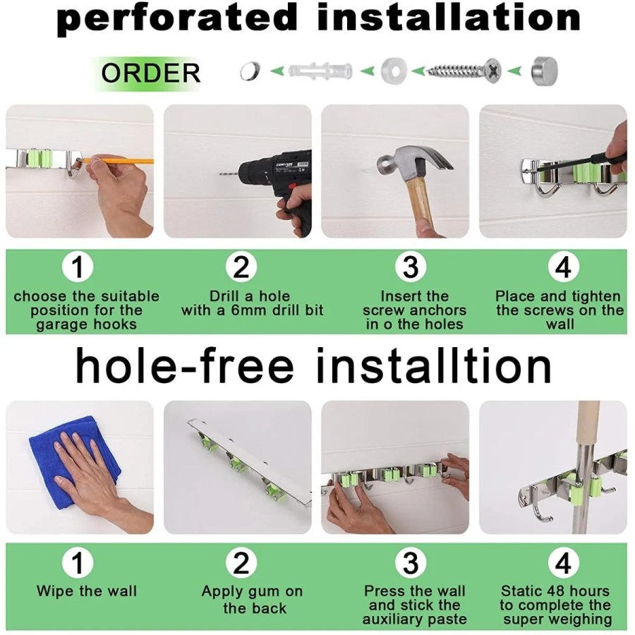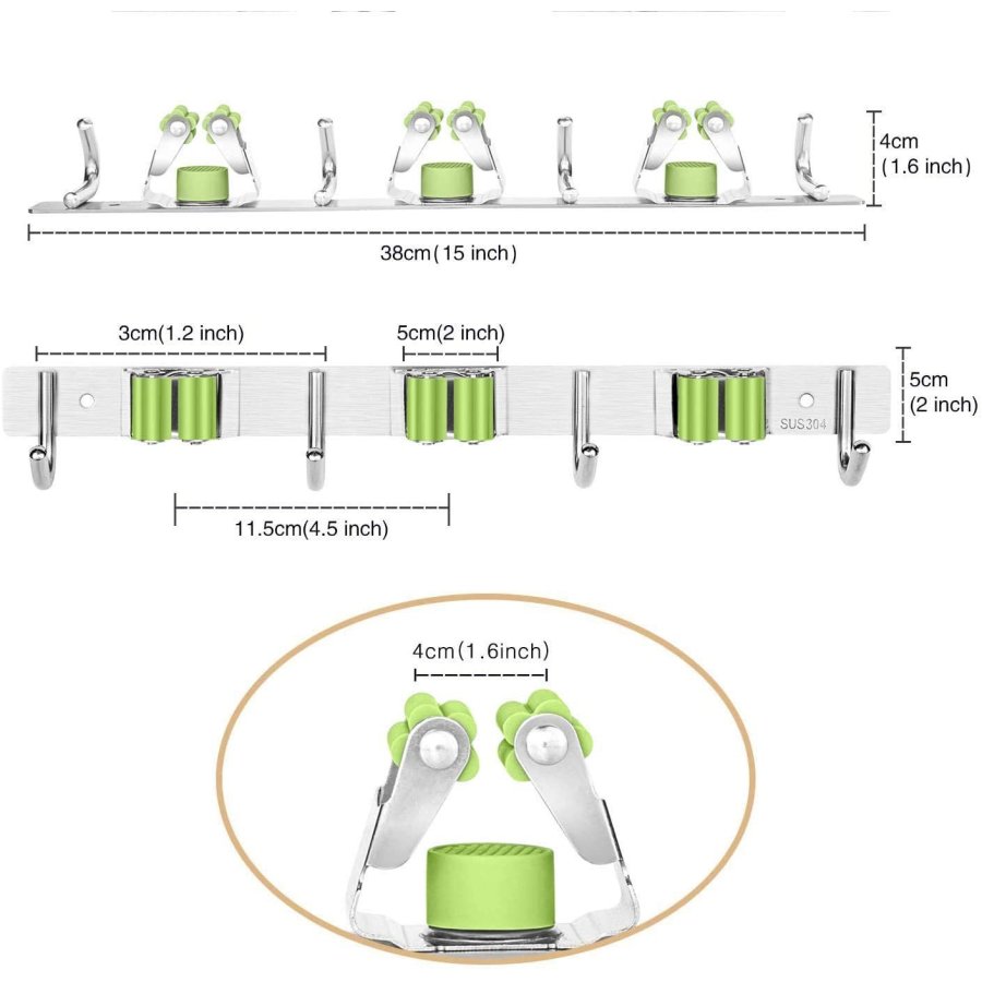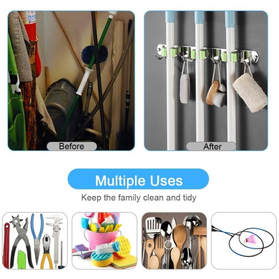 • Material de alta calidad: Diseño de 3 estantes y 4 ganchos, organice sus molestas herramientas de limpieza en un espacio pequeño.El soporte para fregona y escoba está hecho de acero inoxidable 304, resistente y duradero, ranuras de doble agarre de goma con resorte, ya sean mopas húmedas, sucias rastrillos o bates de béisbol, garantizamos que nada se resbala (soporta 30 libras)