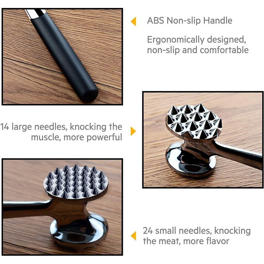 • Mazo de doble cara: cuenta con 2 lados de trabajo, un lado tiene 14 agujas para machacar carnes o aves de corte fino para garantizar una cocción bien equilibrada; y el otro lado tiene 24 agujas para ablandar y producir bistecs perfectos, tiernos y jugosos que son más fáciles de masticar y digerir.