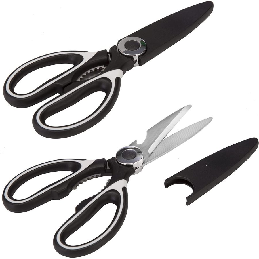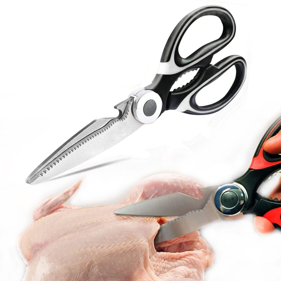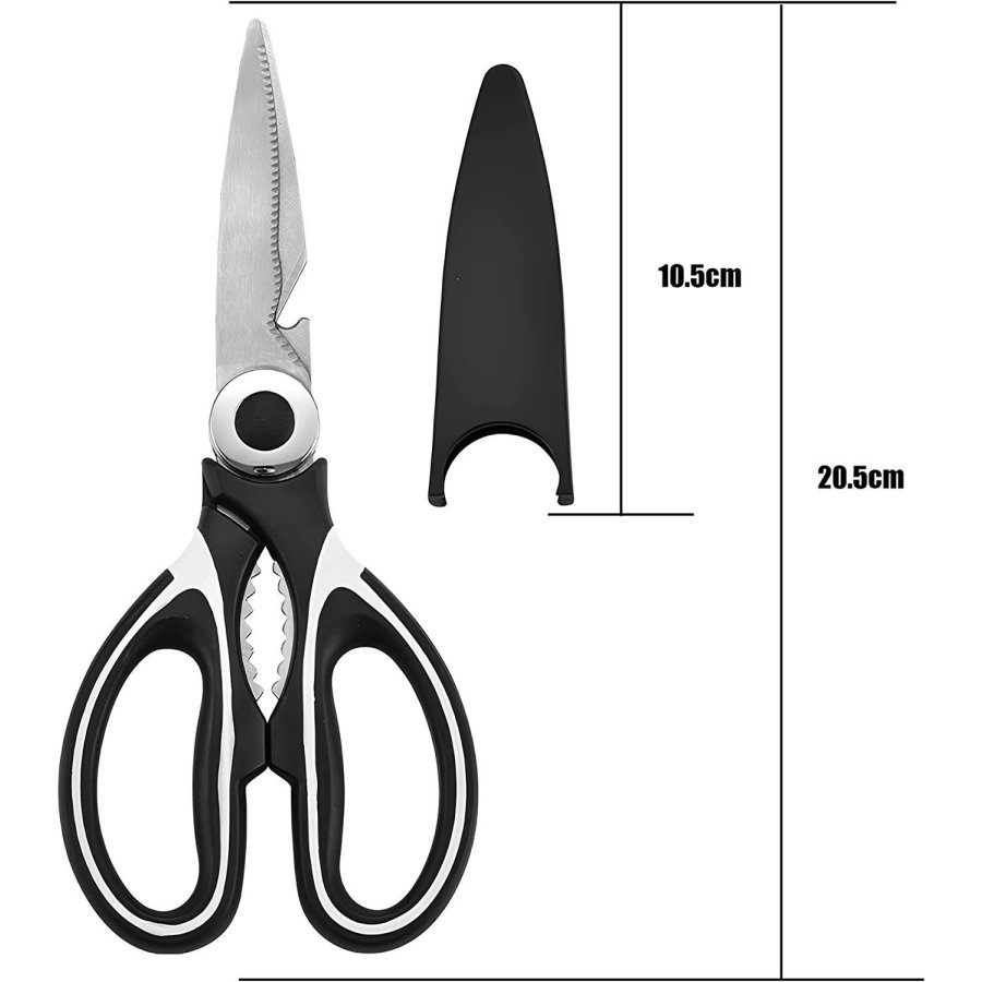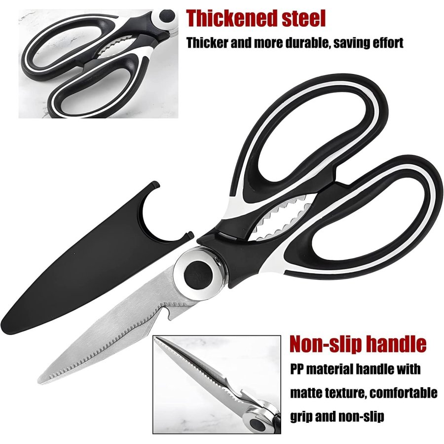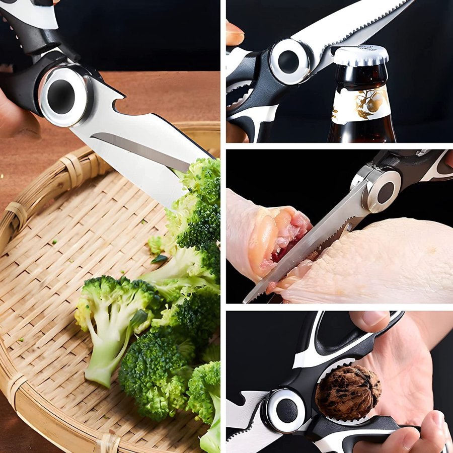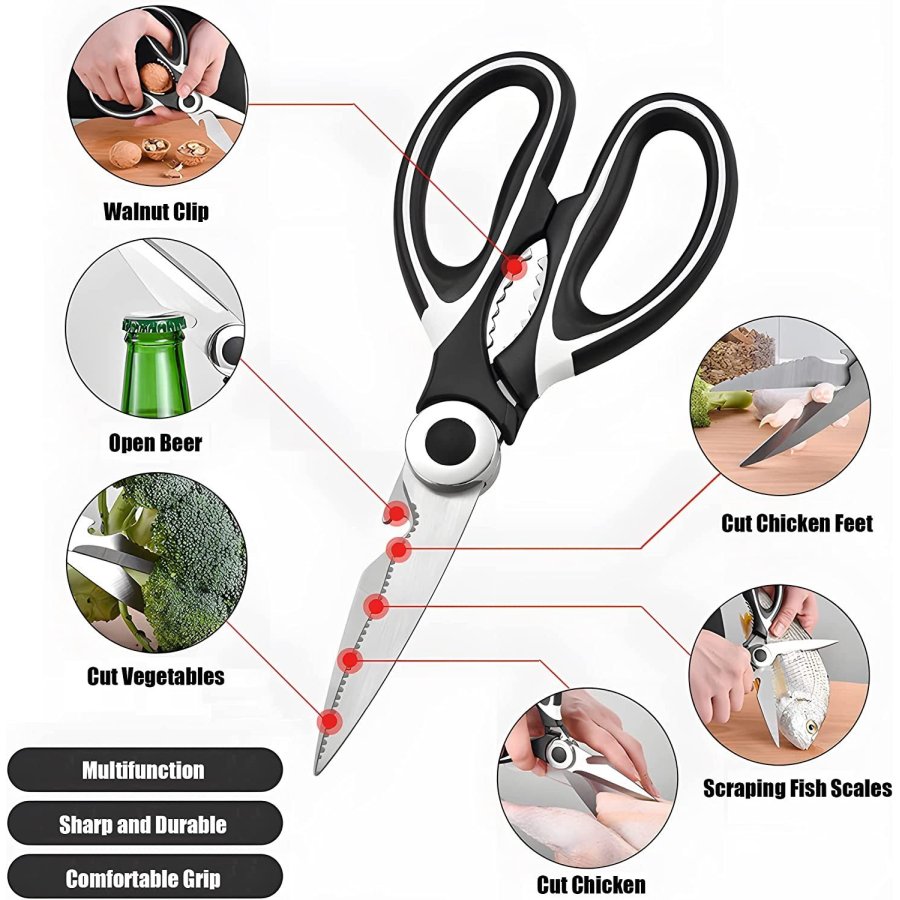 • Tijeras de cocina multiusos: versátiles tijeras de cocina multiusos de 8 pulgadas; útiles para cortar carnes, pollo, tocino, pescado, mariscos, verduras, hierbas y casi cualquier cosa que necesites cortar en tu cocina. Abre tarros o agrieta tuercas con los fuertes dientes de acero entre las asas o utiliza el abridor de botellas para quitar fácilmente las tapas de la botella. La hoja dentada también se puede utilizar para eliminar escamas de peces.