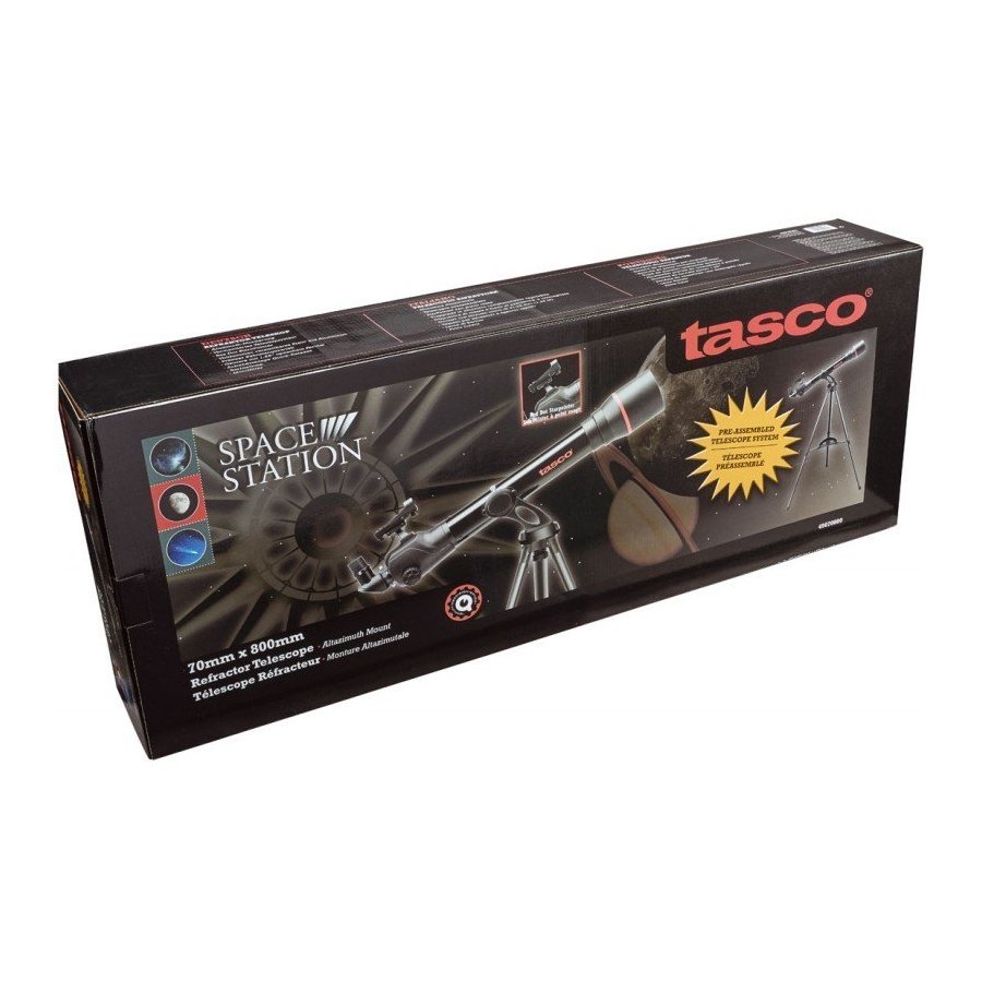 Tasco 49070800 spacestation (TM) – 70 AZ Refractor Telescope 70 mm lente; Diámetro de lente de lente: 800 mm; ocular: 25 mm (32 x 32), 10 mm (80 x), 4 mm (200 x); parcialmente premontado diseño; resistente; único de 70 x Ampliación; Horquilla Brazo Montura altazimutal; Red dot starpointer telescópica; Relación focal: f/11,4; Ajustable trípode de aluminio; Peso: 18.5lbs; Incluye Tasco (R) Firstlight, CD-ROM, lente de Barlow 3 x, mapa de luna y filtro de Luna;