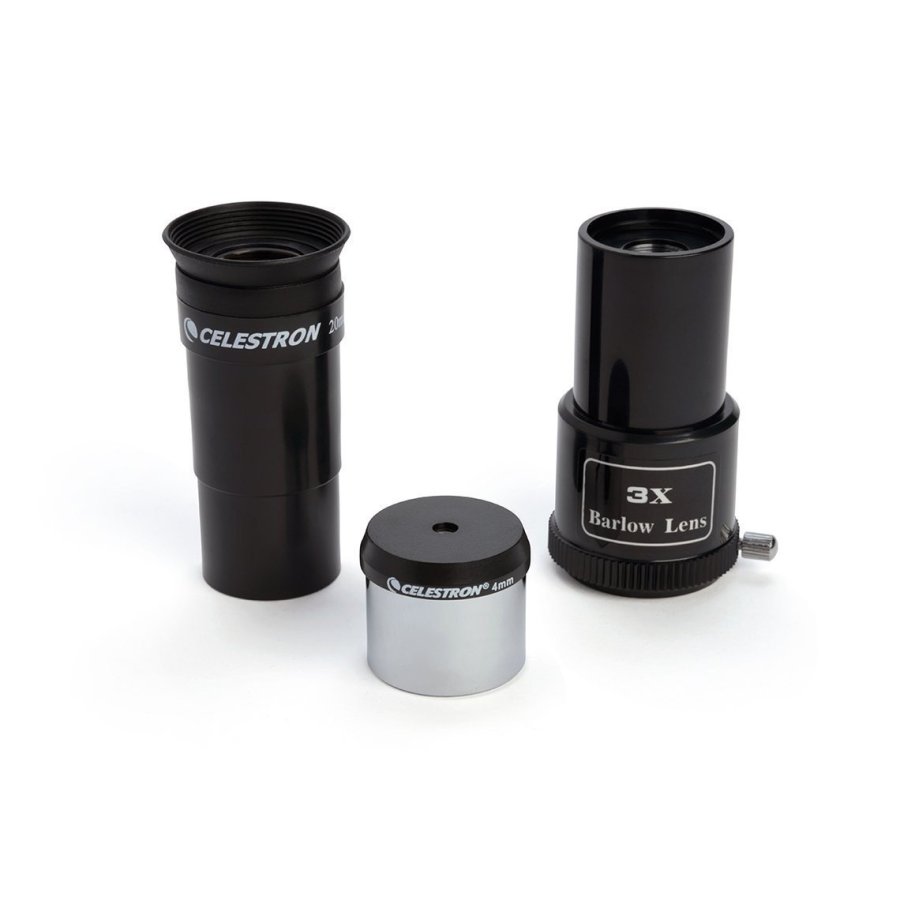 - Los accesorios incluyen un ocular de 20 mm y 4 mm, un buscador, un adaptador para teléfono inteligente y un motor. Los dos oculares ofrecen diferentes aumentos para vistas de baja y alta potencia. La lente 3x Barlow triplica el poder de aumento de cada ocular.